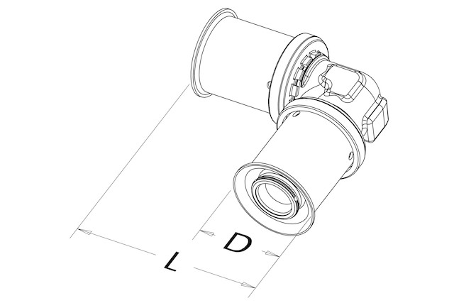 KU-Pressfitting hergestellt aus dem Hochleistungskunststoff PPSU, mit Stützkörper und jeweils zwei fixierten Edelstahl-Hülsen für die unlösbaren Verbindungen mit den Systemrohren DUOPEX S5 und X-PERT S5+