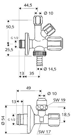 zum kalt- und warmwasserseitigem Anschluss von Einlocharmaturen und zusätzlichem Geräteanschluss, mit Kombi-Eckventil COMFORT (03 545 06 99), 2 COMFORT-Griffe, Rückflussverhinderer RV (EN 1717: EB) im Abgang Geräteanschluss, Fettkammeroberteil, langer Schubschaft, Schlauchverschraubung, zugfeste Messing-Konus-Quetschverschraubung mit Längenausgleich, Schubrosette Ø 54 mm, mit Eckventil mit Regulierfunktion COMFORT (04 917 06 99), COMFORT-Griff, selbstdichtendes Anschlussgewinde (ASAG easy), langer Schubschaft, zugfeste Messing-Konus-Quetschverschraubung mit Längenausgleich, Schubrosette Ø 54 mm, Kombi-Eckventil COMFORT (03 545 06 99): Messing konform TrinkwV, Oberfläche chrom, Anschluss DN 15 G 1/2 AG mit ASAG easy, Abgang Schlauchverschraubung Ø 14,5 mm (DN 20 G 3/4 AG), Ø 10 mm (DN 10 G 3/8 AG), Sicherungseinrichtung gemäß EN 1717: EB, Zertifikate PA-IX 2850/IA, Geräuschklasse I, bei 100% Durchfluss, Durchflussklasse A, Eckventil mit Regulierfunktion COMFORT (04 917 06 99): Messing konform TrinkwV, Oberfläche chrom, Anschluss DN 15 G 1/2 AG mit ASAG easy, Abgang Ø 10 mm (DN 10 G 3/8 AG), Geräuschklasse I, Durchflussklasse A