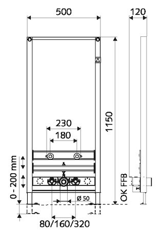für Ständerwand- oder Vorwandmontage, selbsttragender, pulverbeschichteter Profil-Stahlrahmen mit höhenverstellbaren Füßen und Traversen, mit Bidet-Modul, Traverse für Bidet-Befestigung 180/230 mm, höhenverstellbar, Traverse mit Ablaufbogen und Baustopfen, höhenverstellbar, Traverse mit schallentkoppelten Eckventil-Anschlüssen 80/160/320 mm mit Baustopfen, höhenverstellbar, höhenverstellbare Montagefüße 0-20 cm, Befestigungsmaterial für Bidetmontage (Befestigungsbolzen M 12 x 200 mm, Schutzschlauch, Kunststoff-Bundbuchsen, Muttern, Unterlegscheiben, Abdeckkappen), Befestigungsmaterial für Montagefüße, Rahmen Stahl, Oberfläche Rahmen pulverbeschichtet, B 50 cm x H 115 cm, Anschluss Abwasser Ø 50 mm, Anschluss Wasser 2x DN 15 G 1/2 AG (unten), Abgang Abwasser Ø 50/40 mm (durch Ablängen), Abgang Wasser 2x DN 15 G 1/2 IG