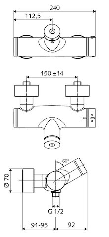 manuelle Auslösung mit automatischem Schließvorgang, mit Selbstschluss-Aufputz-Dusch-Armatur, Selbstschlussknopf SC, Thermostat nach EN 1111, entriegelbare/arretierbare Temperatursperre 38 °C, Verbrühungsschutz bei Ausfall der Kaltwasserversorgung, Selbstschlusskartusche SC II, 2x Rückflussverhinderer RV (EN 1717: EB), 2 S-Anschlüsse und Rosetten (tiefeneinstellbar), Laufzeit 5-30 s einstellbar, max. Betriebstemperatur 70 °C (80 °C für thermische Desinfektion), Gehäuse Messing konform TrinkwV, Oberfläche chrom, Anschluss 2x DN 15 G 1/2 AG, Abgang DN 15 G 1/2 AG (unten), Zertifikate: PA-IX 28574/IB, DVGW, ACS, Belgaqua, Geräuschklasse I bei 100 % Durchfluss, Durchflussklasse B