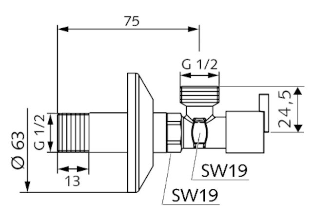 Design-Griff, gemäß DIN 3227, mit Eckventil (lange Bauform), polierter Messingkörper, langer Schubschaft 44,5 mm, Schubrosette Ø 63 mm, aus Messing konform TrinkwV, Betätigung aus Kunststoff, Oberfläche chrom, Anschluss DN 15 G 1/2 AG, Abgang DN 15 G 1/2 AG, Zertifikate: P-IX 212/IA, ACS, WRAS, Geräuschklasse I, Durchflussklasse A
