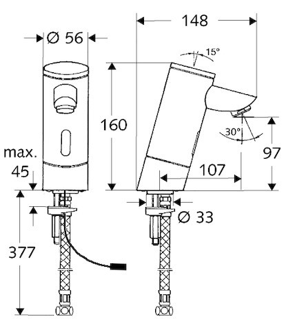Hochdruck Kaltwasser/vorgemischtes Wasser, Infrarot-Sensor gesteuert, Netzbetrieb, geeignet zur Vernetzung mit Wassermanagement-System SWS, parametrierbar über Single Control SSC, mit Infrarot-Sensor-Einlocharmatur, Infrarot-Sensor-Elektronik, programmierbar, Magnetventil 6 V mit Vorfilter, Strahlregler, Steckernetzteil bzw. Unterputznetzteil 9 VDC, 100-240 VAC, 50-60 Hz, flexibler Anschlussschlauch Clean-Fix S G 3/8 IG x 380 mm, mit Vorfilter, Befestigungsmaterial für Waschtischmontage, Einstellmöglichkeiten über SWS/SSC: Sensor-Reichweite (kurz/mittel/lang), Programmierung über Nahreflex (Aus/Ein), max. Laufzeit (1-360 s), Nachlaufzeit (0,6-60 s), Stagnationsspülung (Aus/5-600 s, alle 1-240 h nach letzter Spülung/alle 1-240 h), Dauerspülung für thermische Desinfektion, mit Verbrühungsschutz (Aus/15-600 s), Dauerfluss (Aus/15-600 s), Energiesparmodus (Aus/1-254 h nach letzter Nutzung), Reinigungsstopp (Aus/60-360 s), Einstellmöglichkeiten über Nahreflex: Sensor-Reichweite (kurz/mittel/lang), Stagnationsspülung (Aus/30 s, alle 24 h nach letzter Spülung/alle 24 h), Dauerspülung für thermische Desinfektion, mit Verbrühungsschutz (Aus/300 s/120 s), Reinigungsstopp (Aus/60 s), Durchfluss max. 5 l/min, druckunabhängig, Fließdruck 1-5 bar, max. Ruhedruck 8 bar, max. Betriebstemperatur 70 °C (80 °C für thermische Desinfektion), Gehäuse aus Messing konform TrinkwV, Oberfläche chrom, Anschluss G 3/8 IG, Zertifikate: P-IX 9523-I, ACS, SVGW, WELL public, Geräuschklasse I