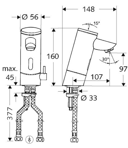 Hochdruck Mischwasser, Infrarot-Sensor gesteuert, Batteriebetrieb, geeignet zur Vernetzung mit Wassermanagement-System SWS, parametrierbar über Single Control SSC, mit Infrarot-Sensor-Einlocharmatur, Temperaturregler, Infrarot-Sensor-Elektronik, programmierbar, Magnetventil 6 V mit Vorfilter, Strahlregler, Batteriefach 6 V (integriert), 4x AAA Alkalibatterien 1,5 V, 2 flexible Anschlussschläuche Clean-Fix S G 3/8 IG x 380 mm, mit integriertem Rückflussverhinderer (RV, EN 1717: EB) und Vorfilter, Befestigungsmaterial für Waschtischmontage, Einstellmöglichkeiten über SWS/SSC: Sensor-Reichweite (kurz/mittel/lang), Programmierung über Nahreflex (Aus/Ein), max. Laufzeit (1-360 s), Nachlaufzeit (0,6-60 s), Stagnationsspülung (Aus/5-600 s, alle 1-240 h nach letzter Spülung/alle 1-240 h), Dauerspülung für thermische Desinfektion, mit Verbrühungsschutz (Aus/15-600 s), Dauerfluss (Aus/15-600 s), Energiesparmodus (Aus/1-254 h nach letzter Nutzung), Reinigungsstopp (Aus/60-360 s), Einstellmöglichkeiten über Nahreflex: Sensor-Reichweite (kurz/mittel/lang), Stagnationsspülung (Aus/30 s, alle 24 h nach letzter Spülung/alle 24 h), Dauerspülung für thermische Desinfektion, mit Verbrühungsschutz (Aus/300 s/120 s), Reinigungsstopp (Aus/60 s), Durchfluss max. 5 l/min druckunabhängig, Fließdruck 1-5 bar, max. Ruhedruck 8 bar, max. Betriebstemperatur: 70 °C (80 °C für thermische Desinfektion), Gehäuse aus Messing konform TrinkwV, Oberfläche chrom, Anschluss G 3/8 IG, Zertifikate: P-IX 9523-I, ACS, Belgaqua, SVGW, WELL public, Geräuschklasse I