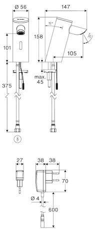 9 VDC, 100 - 240 VAC, 50 - 60 Hz, berührungslose, sensorgesteuerte Armatur mit innovativer ToF-Technologie, unempfindlich gegenüber reflektierenden Materialien wie z.B. Spiegeln, Warnwesten etc., mit integrierter Bluetooth-Schnittstelle, parametrierbar über SCHELL App, geeignet zur Vernetzung mit SCHELL Wassermanagement-System SWS, Einstellmöglichkeiten über SCHELL App, Parametrierung über voreingestellte Betriebsmodi (Strom sparen / Wasser sparen / Komfort), individuelle Einstellungen im Expertenmodus (Sensor-Reichweite, Sensor-Messintervall, Personenerkennung, max. Laufzeit, Nachlaufzeit), Stagnationsspülung (Aus / im Intervall / Bedarfsgerechtes Spülen unter Berücksichtigung der Nutzungen / zu festen Terminen )Tag(e), Uhrzeit), Dauerspülung für thermische Desinfektion, Auslösung per App (3 - 10 min), Dauerfluss, Auslösung per App (15 - 600 s), Reinigungsstopp, Auslösung per App oder Nahreflex (Aus / 60 – 360 s), Durchfluss max. 5 l/min druckunabhängig, Fließdruck 1,0 - 5,0 bar, max. Ruhedruck 8 bar, max. Betriebstemperatur 70 °C (80 °C für thermische Desinfektion), Werkstoff Gehäuse Messing, Oberfläche chrom, Anschluss G 3/8 IG, bestehend aus Time-of-Flight-Sensor-Einlocharmatur, Time-of-Flight-Sensor-Elektronik (ToF) mit automatischer Justierung des Sensorbereichs, Axialmagnetventil 6 V mit Vorfilter, versenkter Strahlregler (diebstahlgeschützt), Anschlusskabel 220 mm, mit Steckverbinder 3-polig, Schutzklasse IP 65, flexibler Anschlussschlauch Clean-Fix S G 3/8 IG x 410 mm, mit integriertem Rückflussverhinderer (RV, EN 1717: EB) und Vorfilter, Befestigungsmaterial für Waschtischmontage