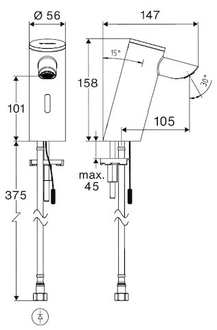 berührungslose, sensorgesteuerte Armatur mit innovativer ToF-Technologie, unempfindlich gegenüber reflektierenden Materialien wie z.B. Spiegeln, Warnwesten etc., mit integrierter Bluetooth-Schnittstelle, parametrierbar über SCHELL App, geeignet zur Vernetzung mit SCHELL Wassermanagement-System SWS, exklusiv Stromversorgung, vorgesehen zur Spannungsversorgung über SCHELL Wassermanagement-System SWS oder zentralem Netzteil, Einstellmöglichkeiten über SCHELL App, Parametrierung über voreingestellte Betriebsmodi (Strom sparen / Wasser sparen / Komfort), individuelle Einstellungen im Expertenmodus (Sensor-Reichweite, Sensor-Messintervall, Personenerkennung, max. Laufzeit, Nachlaufzeit), Stagnationsspülung (Aus / im Intervall / Bedarfsgerechtes Spülen unter Berücksichtigung der Nutzungen / zu festen Terminen )Tag(e), Uhrzeit), Dauerspülung für thermische Desinfektion, Auslösung per App (3 - 10 min), Dauerfluss, Auslösung per App (15 - 600 s), Reinigungsstopp, Auslösung per App oder Nahreflex (Aus / 60 – 360 s), Durchfluss max. 5 l/min druckunabhängig, Fließdruck 1,0 - 5,0 bar, max. Ruhedruck 8 bar, max. Betriebstemperatur 70 °C (80 °C für thermische Desinfektion), Werkstoff Gehäuse Messing, Oberfläche chrom, Anschluss G 3/8 IG, bestehend aus Time-of-Flight-Sensor-Einlocharmatur, Time-of-Flight-Sensor-Elektronik (ToF) mit automatischer Justierung des Sensorbereichs, Axialmagnetventil 6 V mit Vorfilter, versenkter Strahlregler (diebstahlgeschützt), Anschlusskabel 220 mm, mit Steckverbinder 3-polig, Schutzklasse IP 65, flexibler Anschlussschlauch Clean-Fix S G 3/8 IG x 410 mm, mit integriertem Rückflussverhinderer (RV, EN 1717: EB) und Vorfilter, Befestigungsmaterial für Waschtischmontage