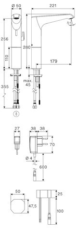 9 VDC, 100 - 240 VAC, 50 - 60 Hz, berührungslose, sensorgesteuerte Armatur mit innovativer ToF-Technologie, unempfindlich gegenüber reflektierenden Materialien wie z.B. Spiegeln, Warnwesten etc., mit integrierter Bluetooth-Schnittstelle,parametrierbar über SCHELL App, geeignet zur Vernetzung mit SCHELL Wassermanagement-System SWS, Einstellmöglichkeiten über SCHELL App, Parametrierung über voreingestellte Betriebsmodi (Strom sparen / Wasser sparen / Komfort), iIndividuelle Einstellungen im Expertenmodus (Sensor-Reichweite, Sensor-Messintervall, Personenerkennung, max. Laufzeit, Nachlaufzeit), Stagnationsspülung (Aus / im Intervall / Bedarfsgerechtes Spülen unter Berücksichtigung der Nutzungen / zu festen Terminen (Tag(e), Uhrzeit), Dauerspülung für thermische Desinfektion, Auslösung per App (3 - 10 min), Dauerfluss, Auslösung per App (15 - 600 s), Reinigungsstopp, Auslösung per App oder Nahreflex (Aus / 60 – 360 s), Durchfluss max. 5 l/min druckunabhängig, Fließdruck 1,0 - 5,0 bar, max. Ruhedruck 8 bar, max. Betriebstemperatur 70 °C (80 °C für thermische Desinfektion), Werkstoff Gehäuse Messing, Oberfläche chrom, Anschluss 2x G 3/8 IG, bestehend aus Time-of-Flight-Sensor-Einlocharmatur, Temperaturregler, Time-of-Flight-Sensor-Elektronik (ToF) mit automatischer Justierung des Sensorbereichs, Axialmagnetventil 6 V mit Vorfilter, versenkter Strahlregler (diebstahlgeschützt), Anschlusskabel 360 mm, mit Steckverbinder 3-polig, Schutzklasse IP 65, flexibler Anschlussschlauch Clean-Fix S G 3/8 IG x 500 mm, mit integriertem Rückflussverhinderer (RV, EN 1717: EB) und Vorfilter, Befestigungsmaterial für Waschtischmontage