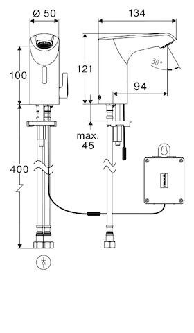 mit 4x AA Alkalibatterien 1,5 V, berührungslose, sensorgesteuerte Armatur mit innovativer ToF-Technologie, unempfindlich gegenüber reflektierenden Materialien wie z.B. Spiegeln, Warnwesten etc., mit integrierter Bluetooth-Schnittstelle,parametrierbar über SCHELL App, geeignet zur Vernetzung mit SCHELL Wassermanagement-System SWS, Einstellmöglichkeiten über SCHELL App, Parametrierung über voreingestellte Betriebsmodi (Strom sparen / Wasser sparen / Komfort), iIndividuelle Einstellungen im Expertenmodus (Sensor-Reichweite, Sensor-Messintervall, Personenerkennung, max. Laufzeit, Nachlaufzeit), Stagnationsspülung (Aus / im Intervall / Bedarfsgerechtes Spülen unter Berücksichtigung der Nutzungen / zu festen Terminen (Tag(e), Uhrzeit), Dauerspülung für thermische Desinfektion, Auslösung per App (3 - 10 min), Dauerfluss, Auslösung per App (15 - 600 s), Reinigungsstopp, Auslösung per App oder Nahreflex (Aus / 60 – 360 s), Durchfluss max. 5 l/min druckunabhängig, Fließdruck 1,0 - 5,0 bar, max. Ruhedruck 8 bar, max. Betriebstemperatur 70 °C (80 °C für thermische Desinfektion), Werkstoff Gehäuse Messing, Oberfläche chrom, Anschluss 2x G 3/8 IG, bestehend aus Time-of-Flight-Sensor-Einlocharmatur, Temperaturregler, Time-of-Flight-Sensor-Elektronik (ToF) mit automatischer Justierung des Sensorbereichs, Axialmagnetventil 6 V mit Vorfilter, versenkter Strahlregler (diebstahlgeschützt), Anschlusskabel 240 mm, mit Steckverbinder 3-polig, Schutzklasse IP 65, 2 flexible Anschlussschläuche Clean-Fix S G 3/8 IG x 410 mm, mit integriertem Rückflussverhinderer (RV, EN 1717: EB) und Vorfilter, Befestigungsmaterial für Waschtischmontage