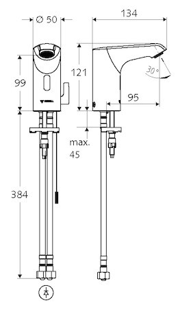 Hochdruck Mischwasser, Infrarot-Sensor gesteuert, geeignet zur Vernetzung mit Wassermanagement-System SWS, parametrierbar über Single Control SSC, vorgesehen zur Spannungsversorgung über Wassermanagement-System SWS oder zentralem Netzteil, mit Infrarot-Sensor-Einlocharmatur, Temperaturregler, Infrarot-Sensor-Elektronik, programmierbar, Axialmagnetventil 6 V mit Vorfilter, , Strahlregler, Anschlusskabel 250 mm, mit Steckverbinder 3-polig, Schutzklasse IP 65, 2 flexible Anschlussschläuche Clean-Fix S G 3/8 IG x 400 mm, mit integriertem Rückflussverhinderer (RV, EN 1717: EB) und Vorfilter, Befestigungsmaterial für Waschtischmontage, Einstellmöglichkeiten über SWS/SSC: Sensor-Reichweite (kurz/mittel/lang), Programmierung über Nahreflex (Aus/Ein), max. Laufzeit (1-360 s), Nachlaufzeit (0,6-60 s), Stagnationsspülung (Aus/5-600 s, alle 1-240 h nach letzter Spülung/alle 1-240 h), Dauerspülung für thermische Desinfektion, mit Verbrühungsschutz (Aus/15-600 s), Dauerfluss (Aus/15-600 s), Energiesparmodus (Aus/1-254 h nach letzter Nutzung), Reinigungsstopp (Aus/60-360 s), Einstellmöglichkeiten über Nahreflex: Sensor-Reichweite (kurz/mittel/lang), Stagnationsspülung (Aus/30 s, alle 24 h nach letzter Spülung/alle 24 h), Dauerspülung für thermische Desinfektion, mit Verbrühungsschutz (Aus/300 s/120 s), Reinigungsstopp (Aus/60 s), Durchfluss max. 5 l/min druckunabhängig, Fließdruck 1,0-5,0 bar, max. Ruhedruck 8 bar, max. Betriebstemperatur 70 °C (80 °C für thermische Desinfektion), Gehäuse aus Messing, wasserführende Teile aus Kunststoff, Oberfläche chrom, Anschluss 2x G 3/8 IG, Zertifikate: P-IX 29072/IO, ACS, Belgaqua, WELL public, Geräuschklasse I, Durchflussklasse O