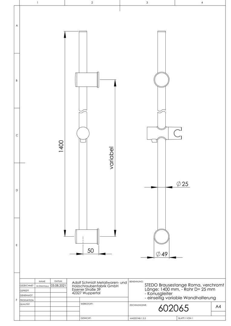 STEDO Brausestange Roma 1400 mm, Rohr d= 25mm, Konusgleiter, verchromt
