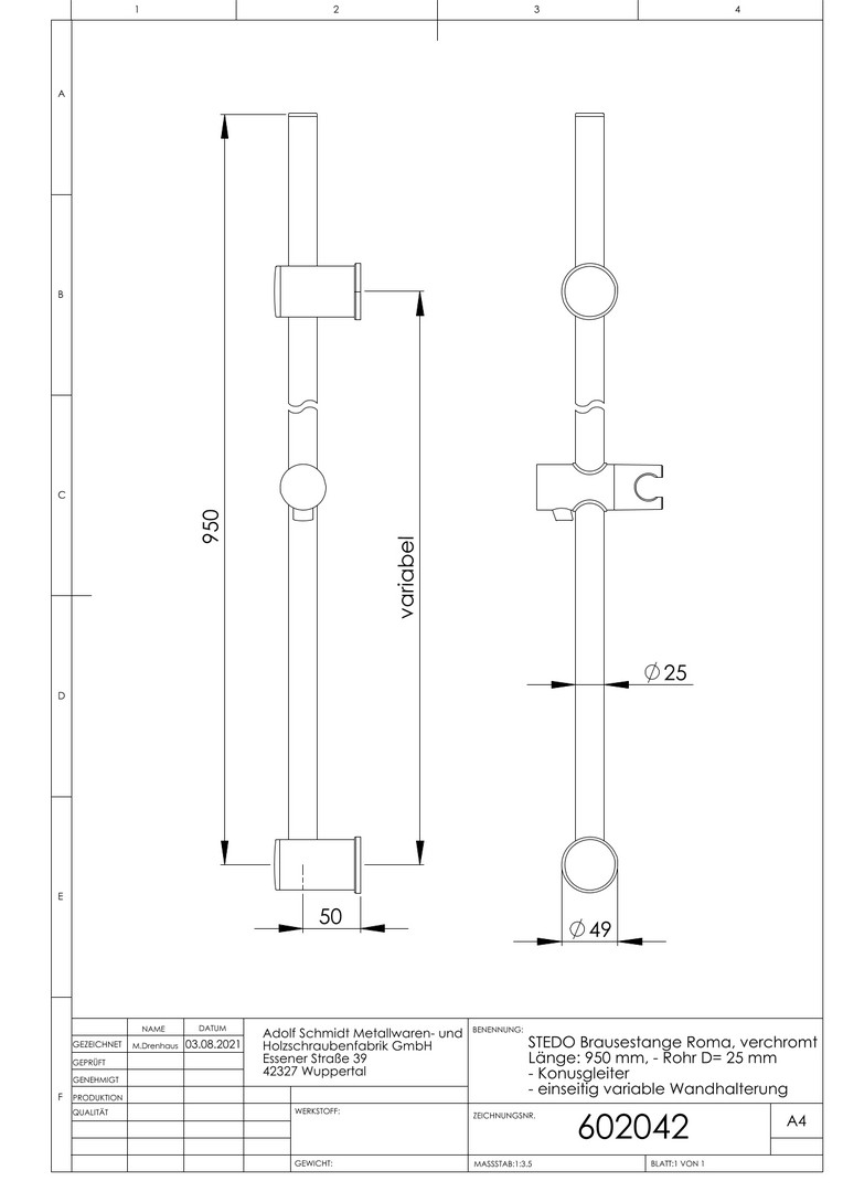 STEDO Brausestange Roma 950 mm, Rohr d= 25mm, Konusgleiter, verchromt