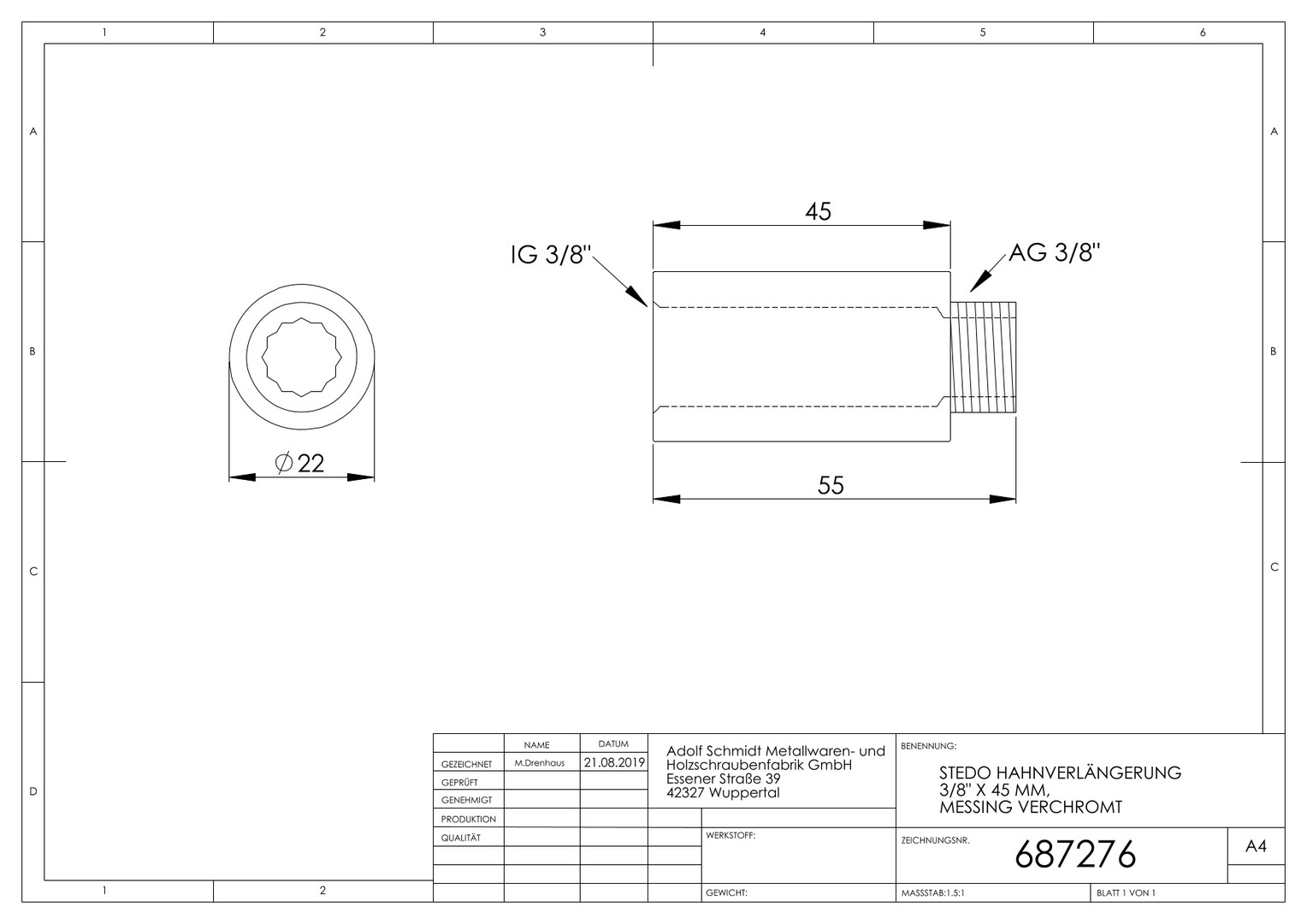 STEDO Hahnverlängerung Messing verchromt, CW617N mit Innenvielkant, 3/8" x 45 mm