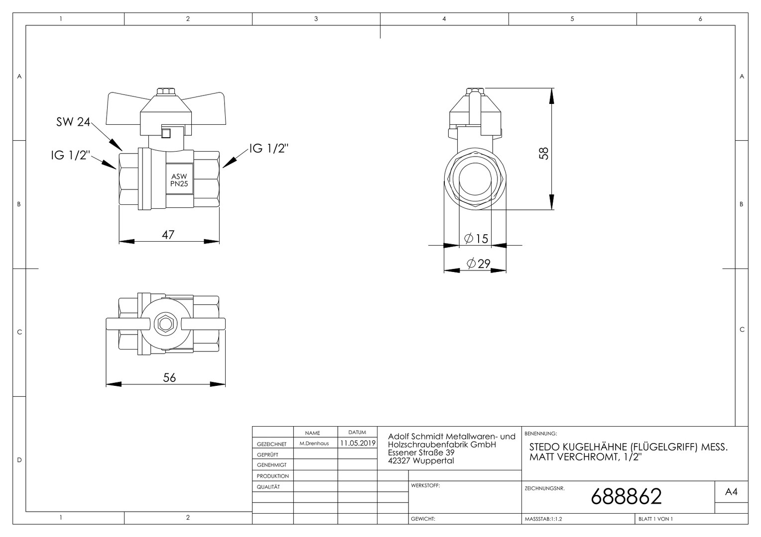 STEDO Kugelhahn Messing matt verchromt, BL 47 mm, IG 1/2" x IG 1/2"