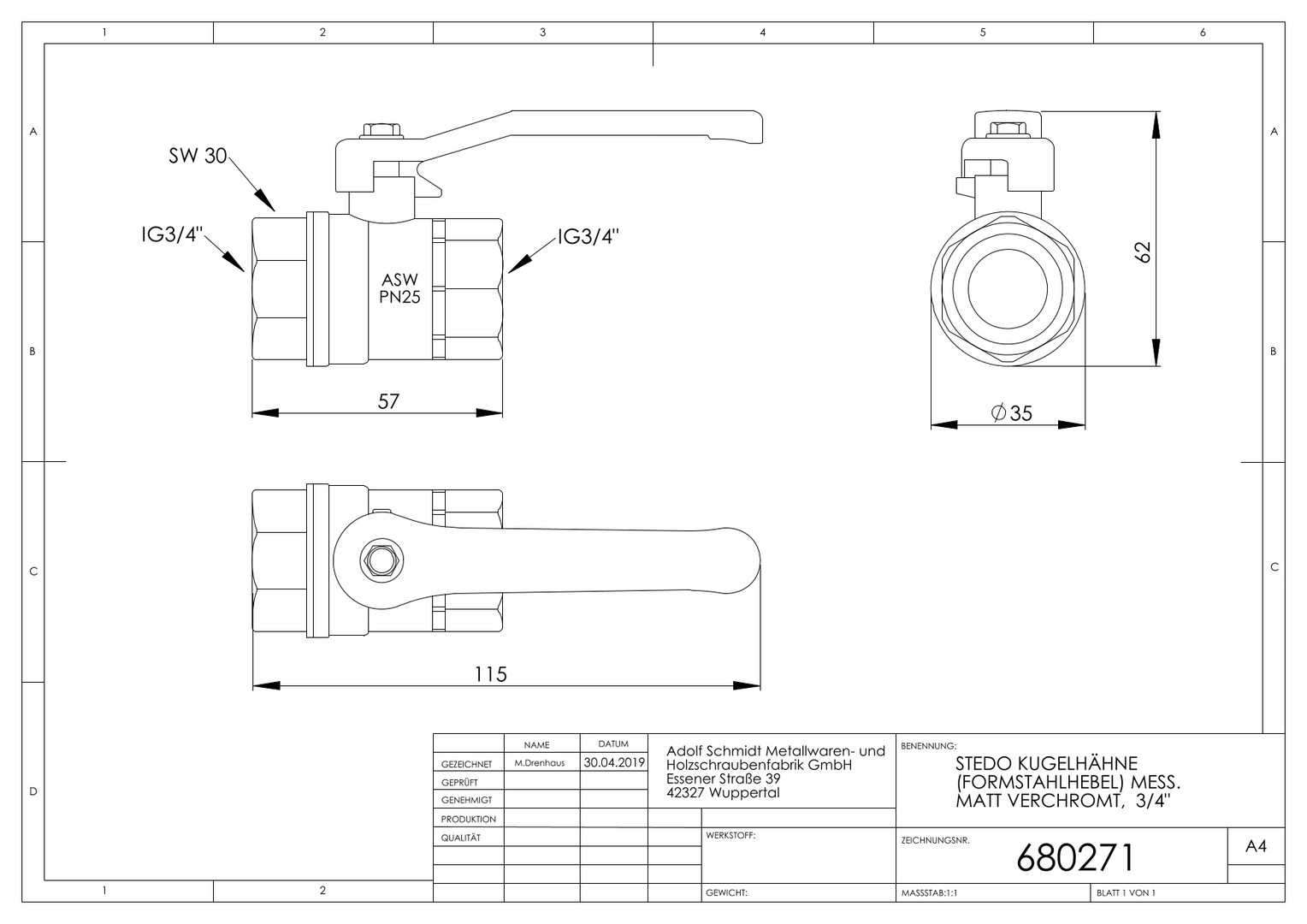 STEDO Kugelhahn Messing matt verchromt, BL 53 mm, IG 3/4" x IG 3/4" W902915