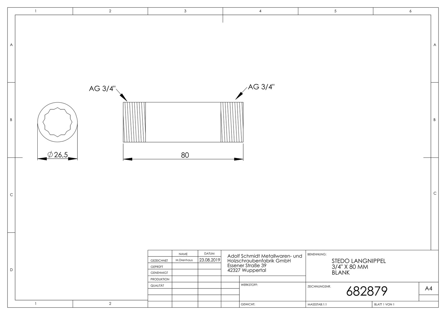 STEDO Langnippel 3/4" x 80 mm, Messing roh, CW617N mit Innenvielkant