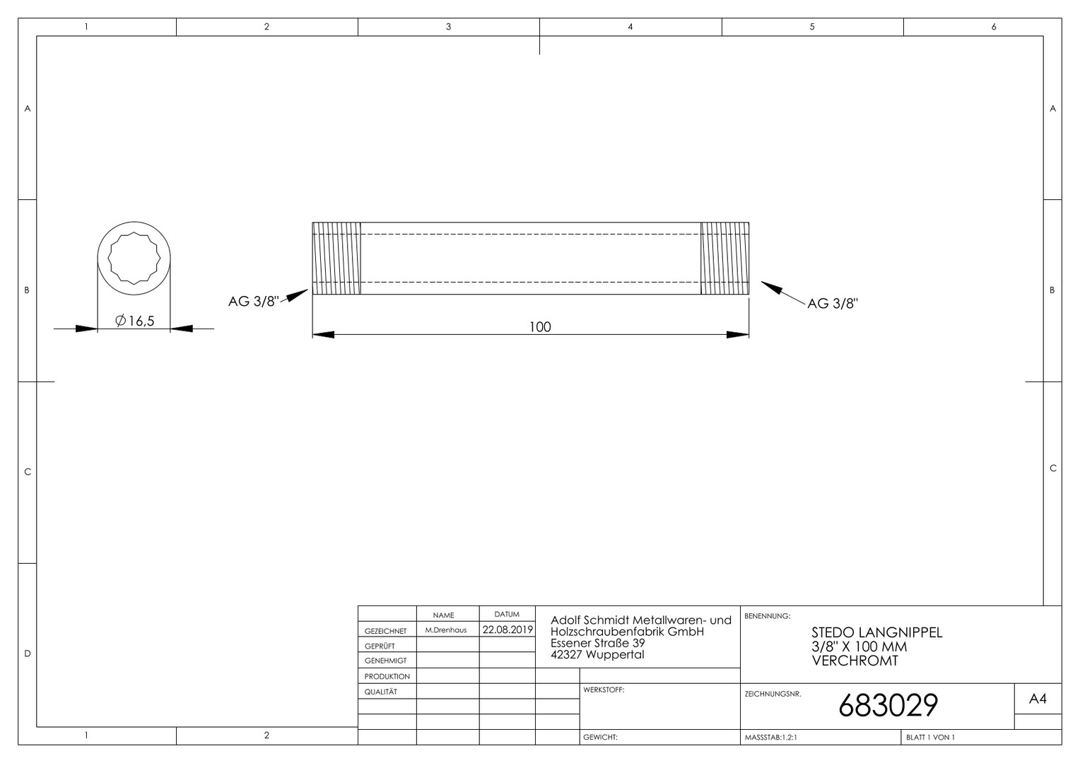STEDO Langnippel 3/8" x 100 mm, Messing verchromt, CW617N mit Innenvielkant W867458