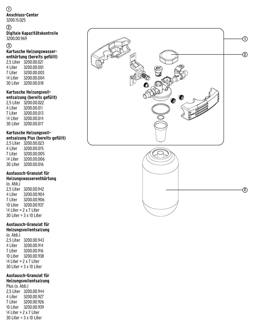 Armatur für Kartuschen, zur Heizungswasser-Enthärtung (HWE)/Heizungswasservollentsalzung (HVE) oder Heizungswasser-Vollentsalzung mit pH-Wert-Stabilisierung (HVE Plus), wiederauffüllbar mit Austausch-Granulat, digitale Kapazitätskontrolle, Verschneideeinrichtung, Leitfähigkeitssensor, Wandhalterung, passendes Kartuschen-System, max. Betriebsdruck 6 bar, max. Betriebstemperatur 30 °C (Eingang)/65 °C (Ausgang), Medium Trinkwasser, Füllleistung 0,5 cbm/h bei 2,5 l Kartusche), Einbaulage Hauptachse waagerecht, Anschlussgröße DN 15