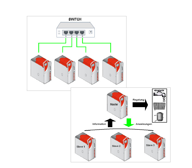 regelt temperatur- und laufzeitabhängig die Kesselschaltfolge, in einem Kaskadensystem sind max. 6 gleiche oder verschiedene Kesseltypen miteinander verbunden, die Kessel in der Kaskade werden über die Ethernetschnittstelle vernetzt, als Verbindungskabel werden Ethernetkabel nach CAT5e verwendet (bauseits), ab 3 Kesseln ist ein Ethernetswitch (bauseits) zu verwenden, die Aktivierung der Kaskadenregelung erfolgt bei der Inbetriebnahme durch den autorisierten Kundendienst, nur in Kombination mit ecomanager-touch einsetzbar