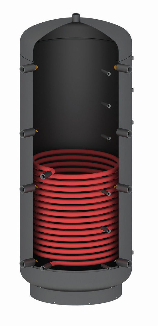 ohne Isolierung, aus Stahlblech S235JR gefertigt, außen lackiert, die Speicher sind zur Speicherung von Heizungswasser geeignet, mit einem eingeschweißten Glattrohrregister zur Solarladung