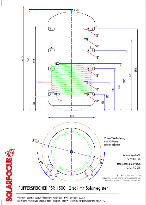ohne Isolierung, aus Stahlblech S235JR gefertigt, außen lackiert, die Speicher sind zur Speicherung von Heizungswasser geeignet, mit einem eingeschweißten Glattrohrregister zur Solarladung
