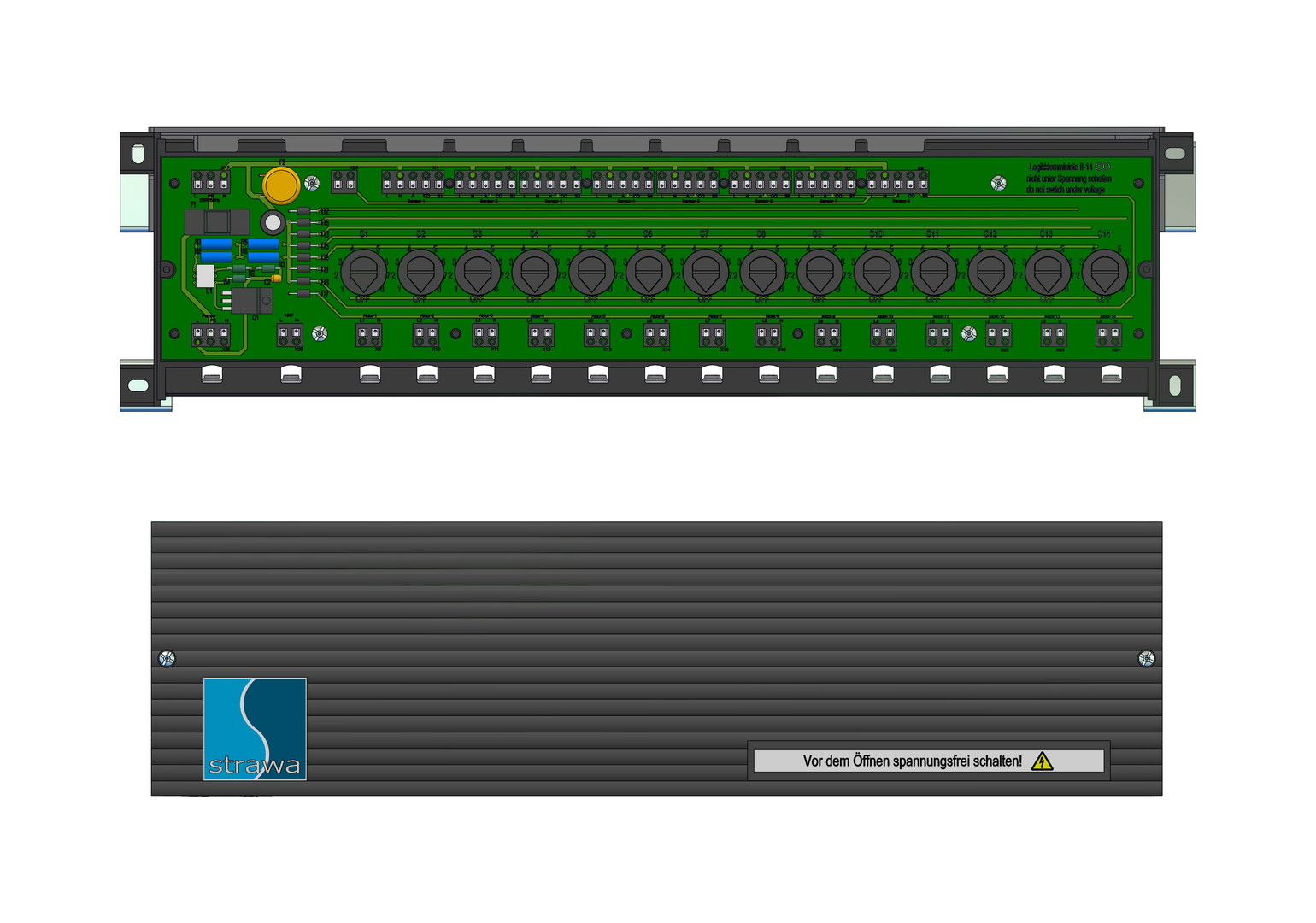 individuelle bauseitige Zuordnung der thermischen Stellantriebe auf die Raumbediengeräte, die jeweiligen Stellantriebe werden über einen Wählschalter den Raumbediengeräten zugeordnet, die Klemmleiste wird im Schrank des Fußbodenheizungsverteilers eingebaut und dient als Verteiler für die Stromversorgung der Stellantriebe und der Raumbediengeräte, über eine Klemme kann eine Pumpe direkt angesteuert werden, ein Pumpenmodul 230 V ist integriert und dient der bedarfsabhängigen Ansteuerung der Pumpe (diese geht in Betrieb sobald ein Stellantrieb aktiv ist), eine individuelle Weitergaben von Zeitbefehlen oder Nachtabsenkung über die Klemmleiste an die Stellantriebe (bei Verwendung von einem Uhrenraumthermostat in Verbindung mit Raumthermostaten mit TA Funktion) ist möglich, über den Anschluss eines externen Temperatur- oder Taupunktwächters lassen sich Überwachungsfunktionen mit Abschaltung der Stellantriebe realisieren, Comfort-strawalogiX: mit Montageblech für Klick-Montage in Comfort-Schränken bzw. Stationen Typ C80, C69, CA und Zugentlastung, strawalogiX: mit Zugenlastungsblech für Schränke Typ 80, 69 und A, strawalogiX RT6/STA8 max. 6 Raumbediengeräte und 8 Stellantriebe, strawalogiX RT8/STA14 max. 8 Raumbediengeräte und 14 Stellantriebe, Integrierte Sicherung 4 AT Varistor als Überspannungsschutz für die Stellantriebe, mit Steckklemmen bis 1,5 qmm, 230 V +-15 %, 50-60 Hz, Pumpenanschluss max. 3,0 A, Sicherung T 4,0 A (5 x 20 mm Feinsicherung), Leistungsaufnahme max. 300 W, Schutzart IP 41, Bemessungsstoßspannung 2,5 kV, Überspannungskategorie II, Verschmutzungsgrad II, max. Anzahl Stellantriebe je Kanal 4 (bauseitige Verteilung notwendig), max. Anzahl Stellantriebe gesamt 18