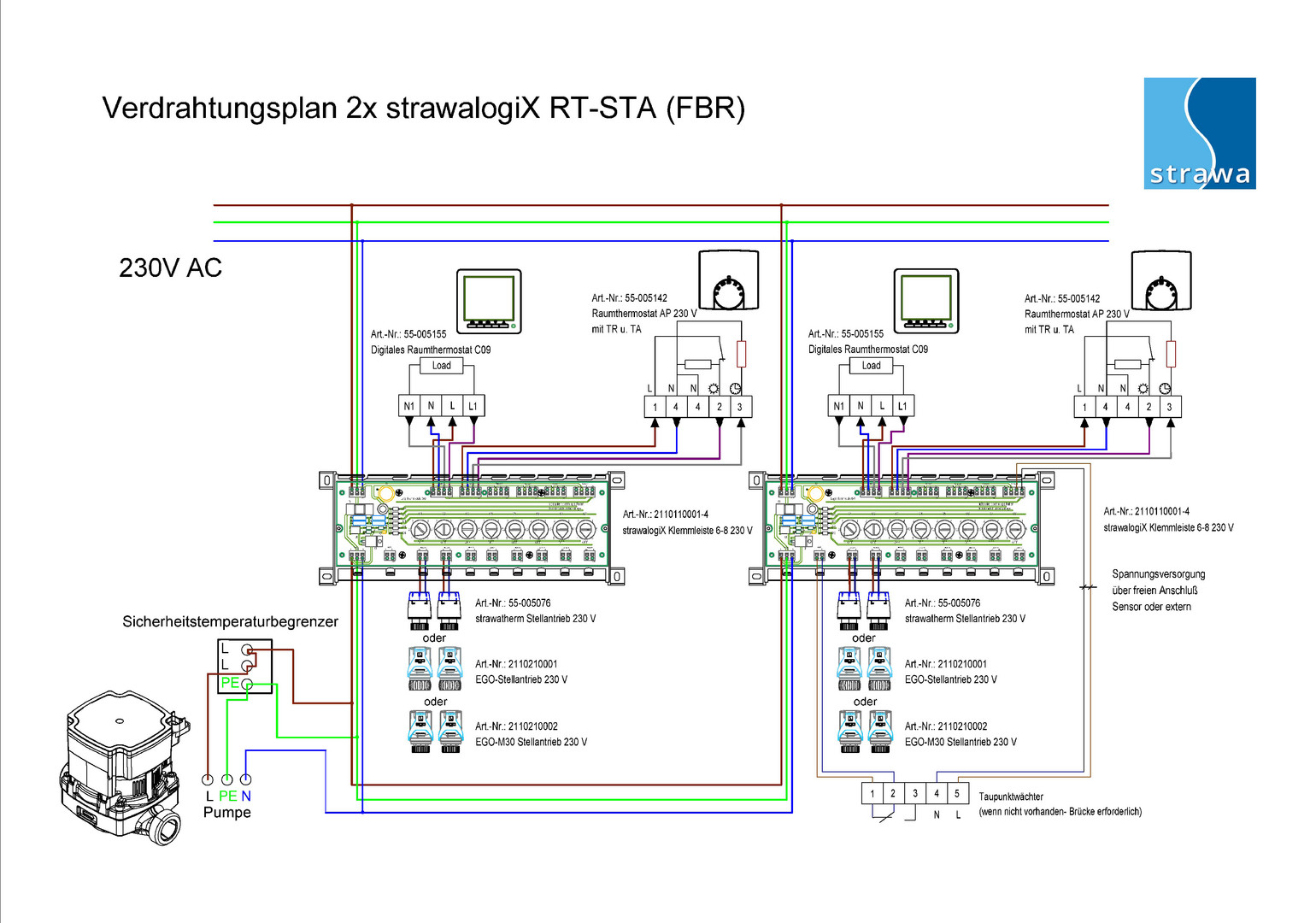 individuelle bauseitige Zuordnung der thermischen Stellantriebe auf die Raumbediengeräte, die jeweiligen Stellantriebe werden über einen Wählschalter den Raumbediengeräten zugeordnet, die Klemmleiste wird im Schrank des Fußbodenheizungsverteilers eingebaut und dient als Verteiler für die Stromversorgung der Stellantriebe und der Raumbediengeräte, über eine Klemme kann eine Pumpe direkt angesteuert werden, ein Pumpenmodul 230 V ist integriert und dient der bedarfsabhängigen Ansteuerung der Pumpe (diese geht in Betrieb sobald ein Stellantrieb aktiv ist), eine individuelle Weitergaben von Zeitbefehlen oder Nachtabsenkung über die Klemmleiste an die Stellantriebe (bei Verwendung von einem Uhrenraumthermostat in Verbindung mit Raumthermostaten mit TA Funktion) ist möglich, über den Anschluss eines externen Temperatur- oder Taupunktwächters lassen sich Überwachungsfunktionen mit Abschaltung der Stellantriebe realisieren, Comfort-strawalogiX: mit Montageblech für Klick-Montage in Comfort-Schränken bzw. Stationen Typ C80, C69, CA und Zugentlastung, strawalogiX: mit Zugenlastungsblech für Schränke Typ 80, 69 und A, strawalogiX RT6/STA8 max. 6 Raumbediengeräte und 8 Stellantriebe, strawalogiX RT8/STA14 max. 8 Raumbediengeräte und 14 Stellantriebe, Integrierte Sicherung 4 AT Varistor als Überspannungsschutz für die Stellantriebe, mit Steckklemmen bis 1,5 qmm, 230 V +-15 %, 50-60 Hz, Pumpenanschluss max. 3,0 A, Sicherung T 4,0 A (5 x 20 mm Feinsicherung), Leistungsaufnahme max. 300 W, Schutzart IP 41, Bemessungsstoßspannung 2,5 kV, Überspannungskategorie II, Verschmutzungsgrad II, max. Anzahl Stellantriebe je Kanal 4 (bauseitige Verteilung notwendig), max. Anzahl Stellantriebe gesamt 18