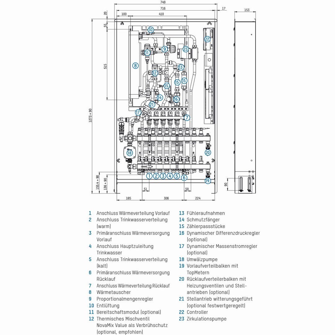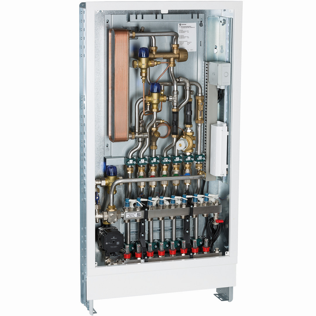 aB 450 MM Breite, Frischwarmwassermodul mit Proportionalmengenregelung, Verbrühschutz NovaMix Value, Bereitschaftsmodul, Differenzdruckregelung primär, Anschlussschiene mit Kugelhähnen, Rücklauf-Anschluss oben komplett vormontiert für Aufputzmontage mit lackierter Abdeckhaube, Trinkwassererwärmung 22 l/min mit 45 °C (70/45 und 35 K)