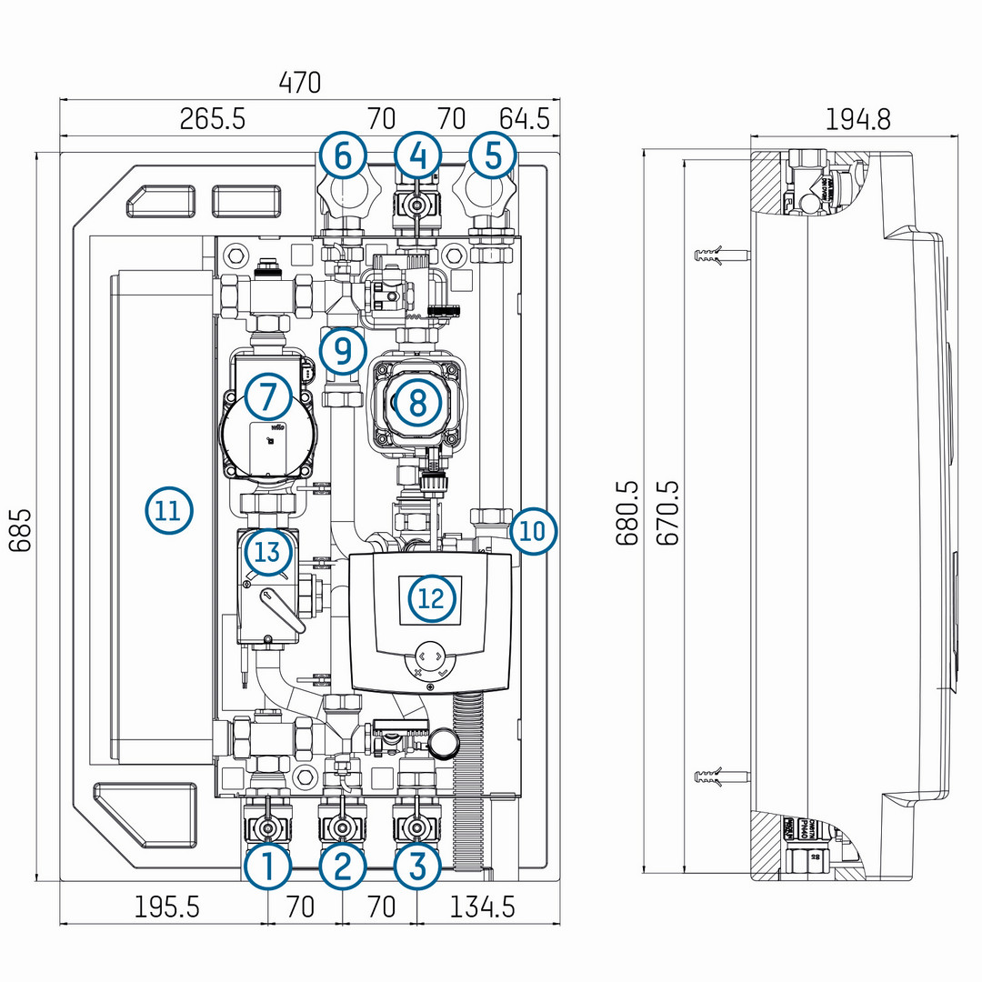 272.2026.000 ohne Zwei-Zonen-Rücklaufeinschichtung, 273.2226.000 ohne Rücklaufeinschichtung, 273.2229.000 mit 2-Zonen Rücklaufeinschichtung, zur Trinkwassererwärmung im Durchflussprinzip mit Heizwasser aus dem Pufferspeicher, integrierter elektronischer Regelung und digitalem Display, komplett anschlussfertig verdrahtet, Designisolierung aus EPP mit Wärmedämmung, Wärmetauscher Kupferlot (Ausführung mit edelstahlgelötetem Wärmetauscher auf Anfrage)