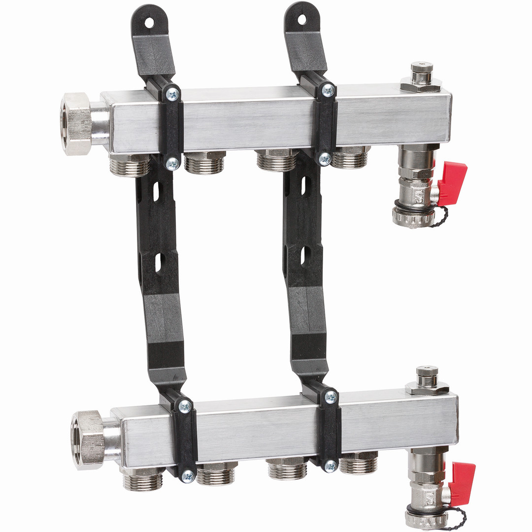 Vor- und Rücklaufbalken aus Edelstahl, TB 80 °C, PB 8 bar 2x automatischer Entlüfter TacoVent Vent und KFE-Hahn, Heizkreisanschlüsse Eurokonus 3/4 AG