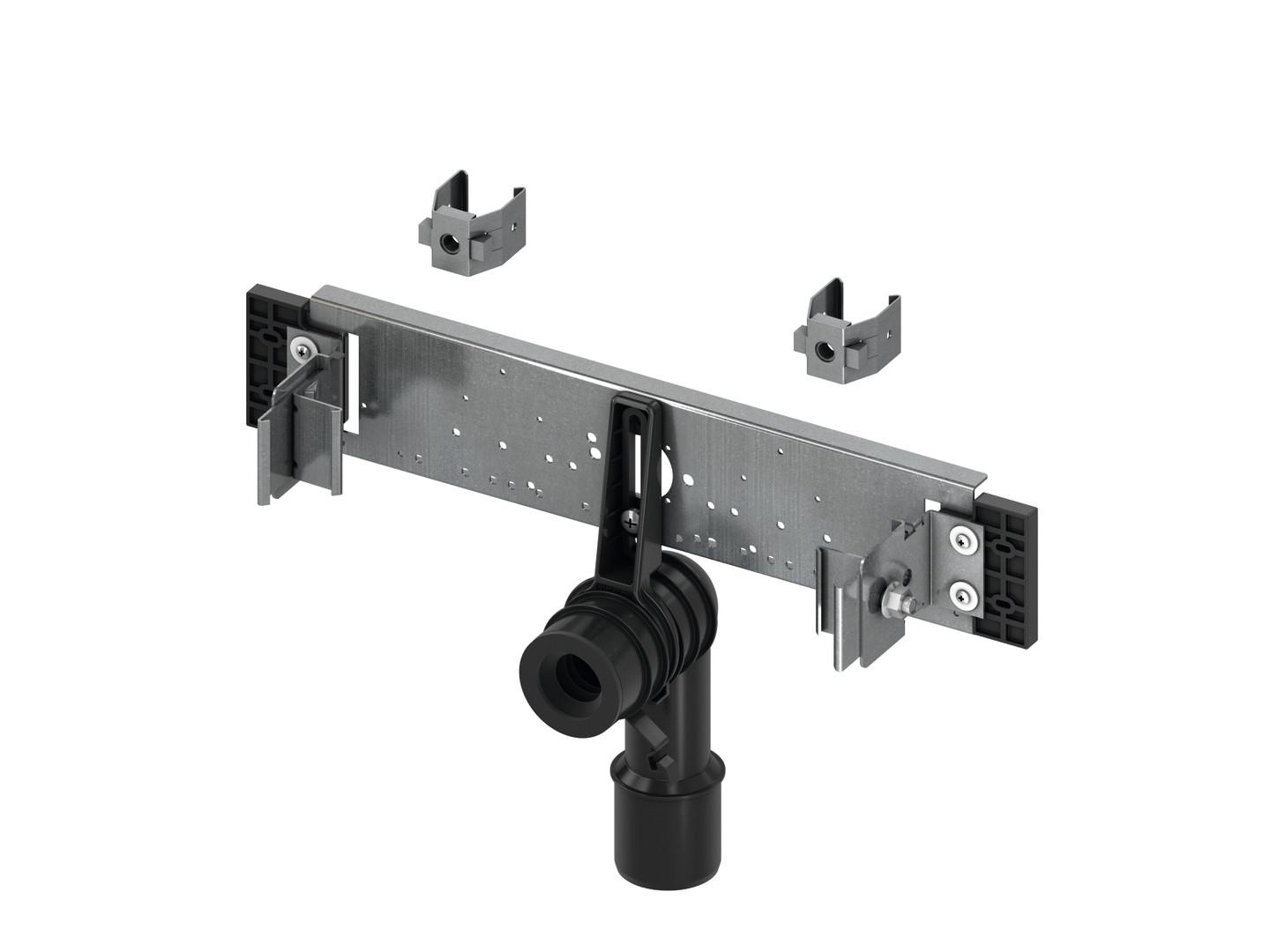 schallentkoppelte Traverse, zur bauseitigen Montage der Hygienebox und Wandscheiben, mit vormontiertem Anschlussbogen DN 50/40, mit Gummimanschette NW 30/50, Bauschutzstopfen, Befestigungsmaterial zur Befestigung an TECEprofil-Profilrohren, 2 x Befestigungsklammer M 10 und Waschtischbefestigungen