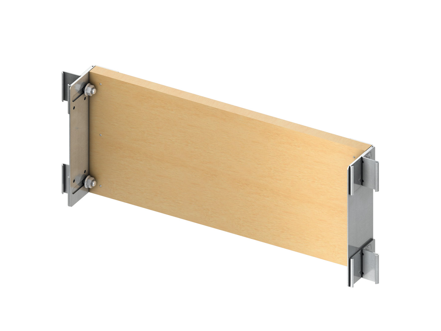 stufenlos tiefenverstellbar, zur Befestigung von UP-Armaturen und anderen Einbauten, vormontierte Einheit bestehend aus: Tragplatte aus wasserfest verleimtem Baufurnierholz gemäß DIN 68705, Montagewinkel (verzinkt) und 4 Multiklemmen