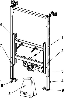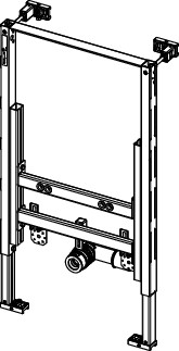 zur Befestigung an TECEprofil-Profilrohren, für den Einbau in Metall- oder Holzständerwände, als Vorwand- oder Eckmodul, komplett vormontierte Einheit bestehend aus selbsttragendem Montagerahmen mit pulverbeschichteter Oberfläche und 2 verstellbaren Fußstützen für einen Fußbodenaufbau von 0-200 mm, 2 Haltebolzen und Muttern M 12, stufenlos höhenverstellbarem Abwasseranschluss, Anschlussbogen DN 40/50 mit Gummimanschette NW 30/50 (zugleich Dichtung) mit Bauschutzstopfen, 2 tiefenverstellbare Modulbefestigunge, in Kombination mit der Teleskopbefestigung 9380001 auch für die Bauhöhe 980 mm in einer TECEprofil-Vorwand einsetzbar
