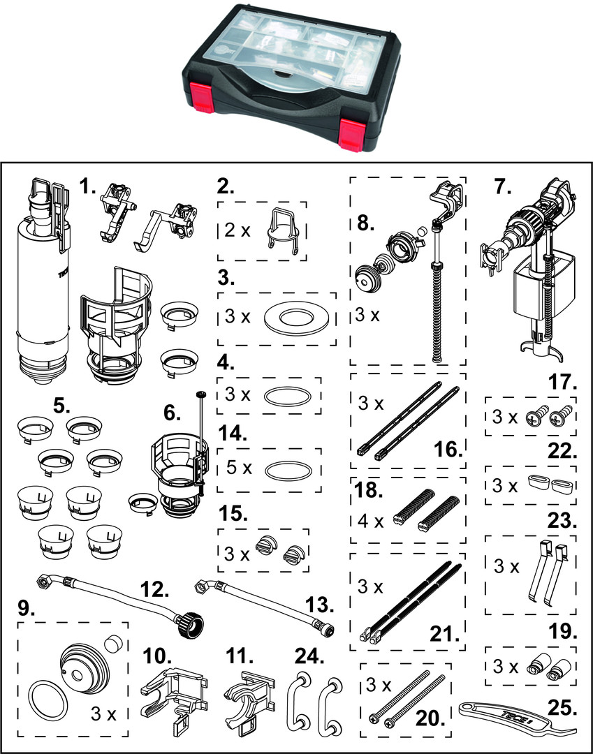Sortimentskoffer aus Kunststoff mit Ersatzteilen bestehend aus: 1x Werk-Nr. 9820223 Ablaufventil A2, 2x Werk-Nr. 9820222 Zugöse, 5x Werk-Nr. 9820233 Fußdichtung für Ablaufventil, 10x Werk-Nr. 9820005 O-Ring am Ventilsitz, 1. Werk-Nr. 9820337 Drosselset für Spülkästen mit einer Bautiefe von 13 cm, 1x Werk-Nr. 9820353 Füllventil F 10 Universal, 3x Werk-Nr. 9820382 Füllventil F 10 Ventilhebelset, 3x Werk-Nr. 9820383 Füllventil F 10 Dichtungsset, 2x Werk-Nr. 9820372 Füllventilhalter für Uni-Spülkasten (17 mm, 3/8", bis 2019), 2x Werk-Nr. 9820373 Füllventilhalter für Uni-Spülkasten (27 mm, M 30, ab 2020), 1x Werk-Nr. Panzerschlauch M 30 (ab 2020), 1x Werk-Nr. 9820026 Panzerschlauch 3/8" (bis 2019), 10x Werk-Nr. 9820025 O-Ring, 5x Werk-Nr. 9820018 Klemmschrauben, 5x Werk-Nr. 9820022 Betätigungsstangen, 10x Werk-Nr. 9820263 Befestigungsschraube, 4x Werk-Nr. 9820019 Befestigungsstangen, 10x Werk-Nr. 9820024 Gummipuffer 2er-Set, 10x Werk-Nr. 9820020 Tastenfedern 2-er Set, 1x Werk-Nr. Bügelgriffe, 1x Werk-Nr. Demontage- und Programmierschlüssel