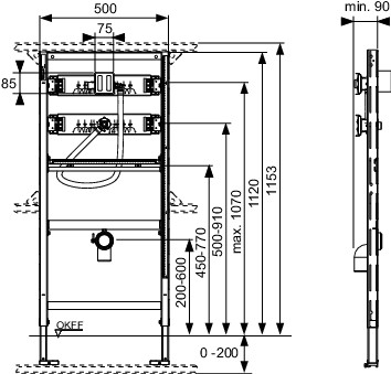 zur Aufnahme von manuellen und elektronischen Betätigungssystemen, zur Befestigung an TECEprofil-Profilrohren oder für den Einbau in Metall- oder Holzständerwände und als Vorwand- oder Eckmodul, komplett vormontierte Einheit bestehend aus TECE Urinalspülergehäuse mit Vorabsperrung und Rohbauschutz, Anschluss Rp 1/2, 2 verstellbaren Fußstützen für einen Fußbodenaufbau von 0-200 mm, 2 Haltebolzen M 8, stufenlos verstellbarer Befestigungsschiene, stufenlos höhenverstellbarem Abwasseranschluss, Anschlussbogen DN 50 mit Bauschutzstopfen, Befestigungsmaterial für Urinal und Einlaufgarnitur
