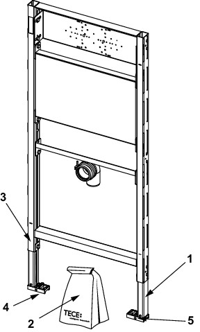 zur Befestigung an TECEprofil-Profilrohren oder für den Einbau in Metall- oder Holzständerwände und als Vorwand- oder Eckmodul, komplett vormontierte Einheit bestehend aus: selbsttragendem Montagerahmen mit pulverbeschichteter Oberfläche, wasserfest verleimte Befestigungsplatte aus Baufurnierholz gemäß DIN 68705, Armaturentraverse zur Befestigung von AP-Armaturen, HT-Anschlussbogen DN 50 mit Bauschutzstopfen
