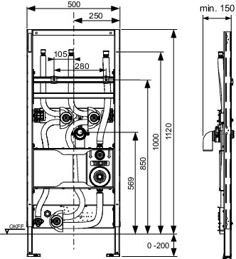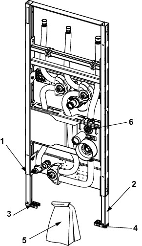 Waschtischmodul zur asymmetrischen Montage für Durchlauferhitzer und Waschtisch, Bauhöhe 1120 mm, Waschtischmodul zur Befestigung an Profilrohren oder für den Einbau in Metall- oder Holzständerwände und als Vorwand- oder Eckmodul, komplett vormontierte Einheit bestehend aus selbsttragendem Montagerahmen, pulverbeschichtet, zwei Haltebolzen M 10, höhen- und seitenverstellbares Abstandsmaß, schallentkoppelte Armaturentraverse, Wandscheiben mit Hygienebox für Kalt-/Warmwasser durchgeschliffen, exzentrisch angeordneter HT Abwasserbogen DN 50 zzgl. HT-Reduzierung DN 50 x 32 mm, werksseitig vorverrohrter Trinkwassereingang 3/4" AG, Montageblock für Wasserzähler G 2" koaxial (HWW Modell), Anschluss Rp 3/4", werksseitig durchgeschliffene und gedämmte Trinkwasserleitung für Kalt-/Warmwasser mit Abgängen 1/2" AG, Armaturentraverse mit zwei Wandscheiben für Kalt- und Warmwasseranschluss, 100 mm Abstand, Holzbrett zur Befestigung von elektronisch geregelten Durchlauferhitzern, eingesetztes Rohrsystem TECEflex, vorgedämmt, kombiniert mit TECEflex Fittings aus Siliziumbronze