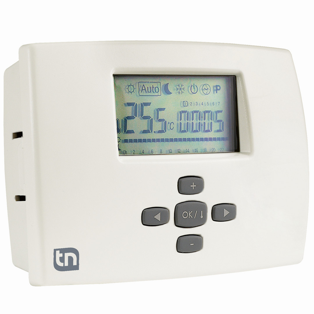 für Stellantriebe, Digitalanzeige mit Wochen- und Tagesprogramm, automatischer oder manueller Betrieb, Einstellbereich 5-35 °C Frostschutz 0,5-10 °C, Schutzklasse II, IP30, Schaltausgang Relais potenzialfrei NC, NO max. 8A