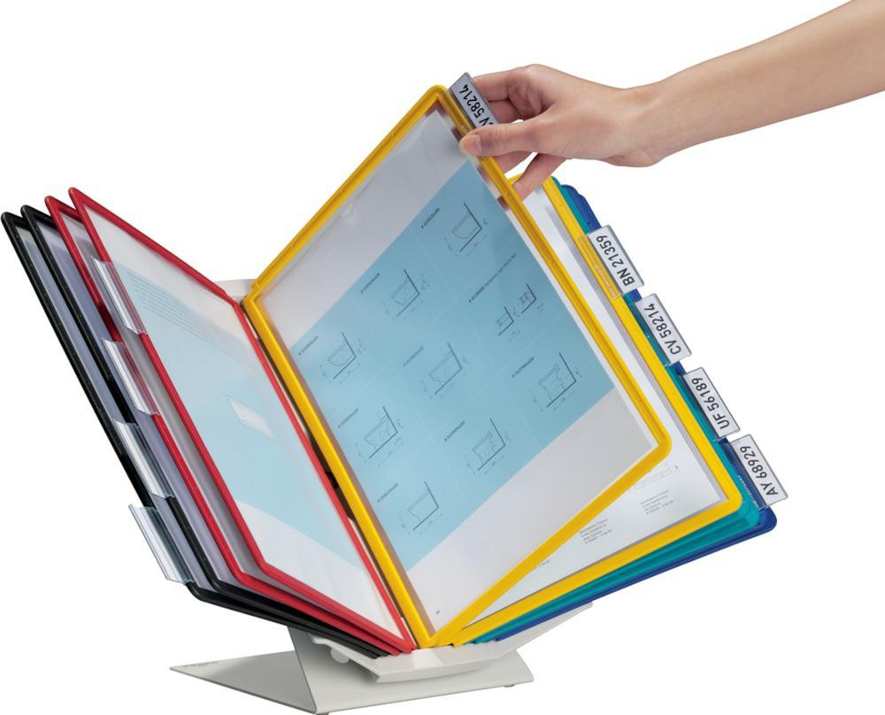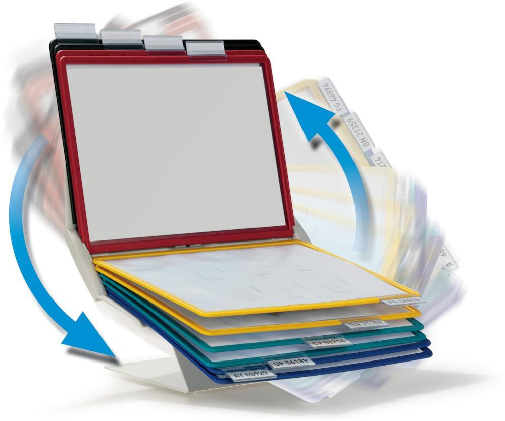 Lieferung: 1 Tischständer/Wandhalter inklusive Befestigungsmaterial, 10 Sichttafeln A4, je 2 in den Farben schwarz, rot, gelb, grün, dunkelblau.
