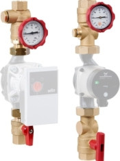 2 Kombi-Verschraubungskugelhähne mit integrierter, aufstellbarer Schwerkraftbremse, Thermometer und Anschluss