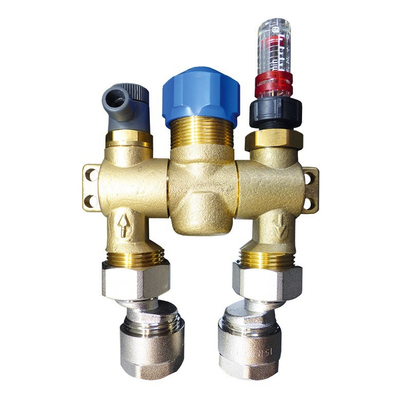 bestehend aus Regeleinheit mit Durchflussmengenanzeiger und Entleerungsventil, Quetschverschraubung 3/4" x 15 mm, TH-Funktion, Exenteranschluss 3/4"