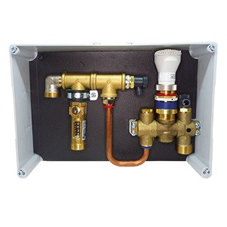 einsetzbar bis max. 100 lfdm Rohr mit 17 mm Ø, mit vier Anschlüssen, Vor- und Rücklauf absperrbar, Wandeinbaukasten mit Drehfix-Multi-Grundkörper und Regelset Vario Design, bestehend aus Thermostatventil mit integriertem Rücklauftemperaturbegrenzer, Entlüftungsventil und Durchflußmengenanzeiger