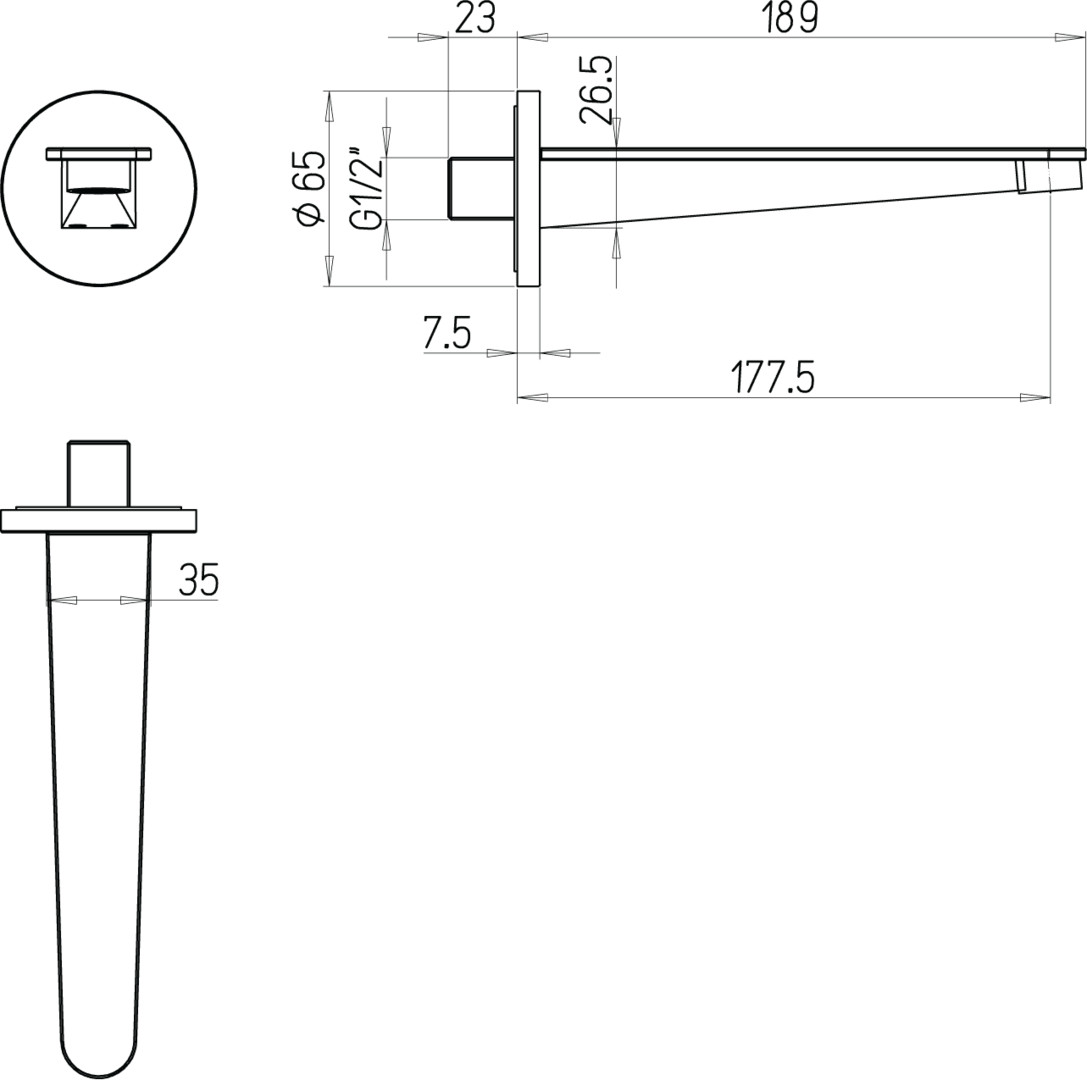 65 x 65 x 189 mm, Rund, Material aus Messing, Wandmontage, Anschlusstyp 1/2'', maximale Durchflussmenge bei 3 bar 20,3 l/min, Auslauflänge 177,5 mm