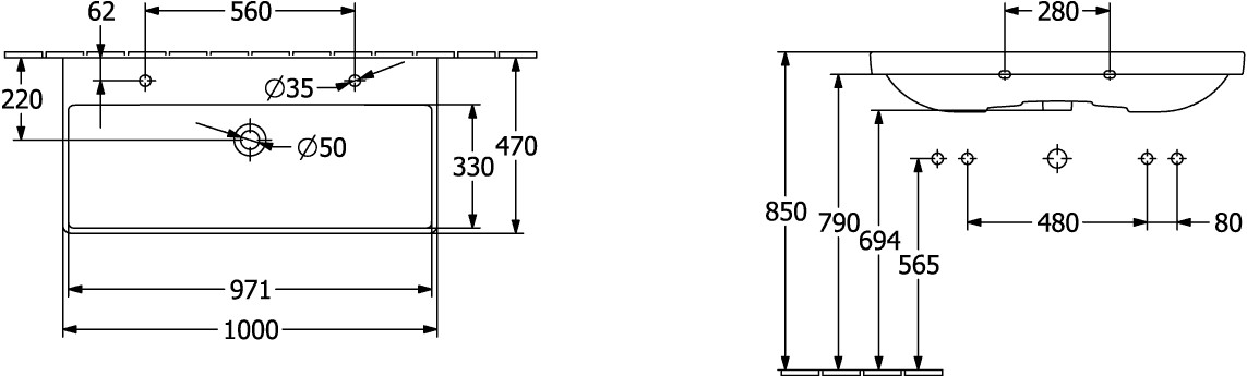 V&B Möbel-Waschtisch AVENTO 100 x 47 cm, 2 Hahnlöcher, mit Überlauf, weiß 264098