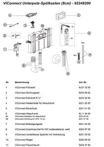 geprüft nach DIN EN 14055, für Wand-WC, für WC bodenstehend, wandnah, Bauschutzkasten für Revisionsöffnung kürzbar, Verbindung zur Betätigungsplatte über Kabeltechnik mit Dreh-Klick-Verbindung, 4 Befestigungspunkte, schwitzwasserisolierter UP-Spülkasten mit 2-Mengenspülung 3/6 l, umstellbar auf 3/4,5 l, max. Spülvolumen 7,5 l, Füllventil Armaturengruppe I, Eckventil-Anschlussset R1/2, Bauschutzkasten für Revisionsöffnung kürzbar, verstellbarer Spülbogen mit Isolierung und Bauschutzkappe, Prüfzeichen für UP-Spülkasten: Armaturengruppe I, Spülrohr weiß, Spülrohrverbinder, Bauschutzkappe und Abdeckrosette weiß, mit Haltewinkeln, Befestigungsmaterial, Armierungsgewebe, ohne Betätigungsplatte, ohne Befestigung und Ablaufbogen für Wand-WC, Einzel-Kartonverpackung