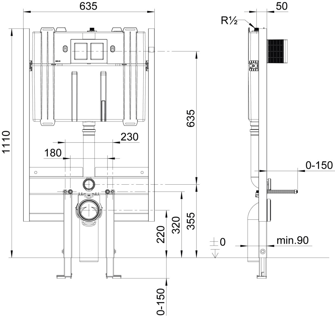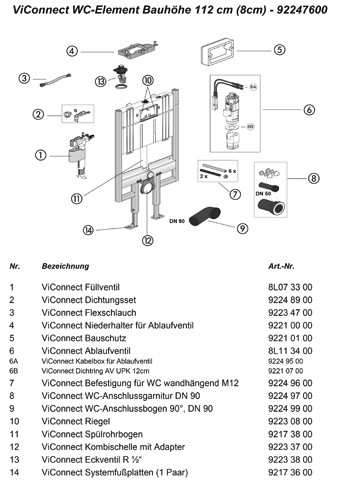 mit Spülkasten 8 cm, Bautiefe min. 9 cm, selbsttragende, pulverbeschichtete Stahlrahmenkonstruktion, komplett vormontiert, geprüft nach DIN EN 14055, für Wand-WC, zur Trockenverkleidung, Einbau vor Massivwand, in Leichtbau-Ständerwand u.v.m, Verbindung zur Betätigungsplatte über Kabeltechnik mit Dreh-Klick-Verbindung, Verstellbereich Füße von Rohfußboden bis OKFFB: 0-20 cm, Tiefe Vorderkante Element: min. 9 cm, mit Spülkasten 8 cm, 6 Befestigungspunkte, schwitzwasserisolierter UP-Spülkasten mit 2-Mengenspülung 3/6 l, umstellbar auf 3/4,5 l, max. Spülvolumen 7,5 l, Füllventil Armaturengruppe I, flexibler Schlauch zum Füllventil von Hand verschraubbar, Eckventil-Anschlussset R1/2, Bauschutzkasten für Revisionsöffnung kürzbar, WC-Anschlussbogen 90° DN 90, mit Übergangsmuffe DN 90/DN 110 mit Bauschutz, WC-Anschlussgarnitur DN 90 komplett, Prüfzeichen für UP-Spülkasten: Armaturengruppe I, mit Wandhalterung, mit Füße und Befestigungsmaterial, 2 WC-Haltebolzen M12 einstellbar 18 cm mit Bauschutz und Muttern, Montageanleitung, Befestigungsmaterial, ohne Betätigungsplatte, Einzel-Kartonverpackung