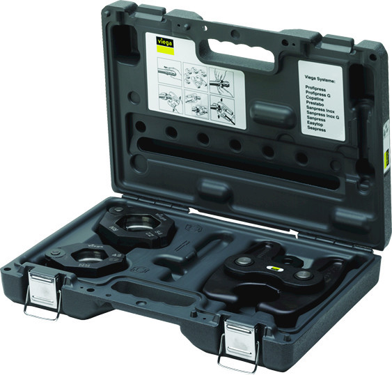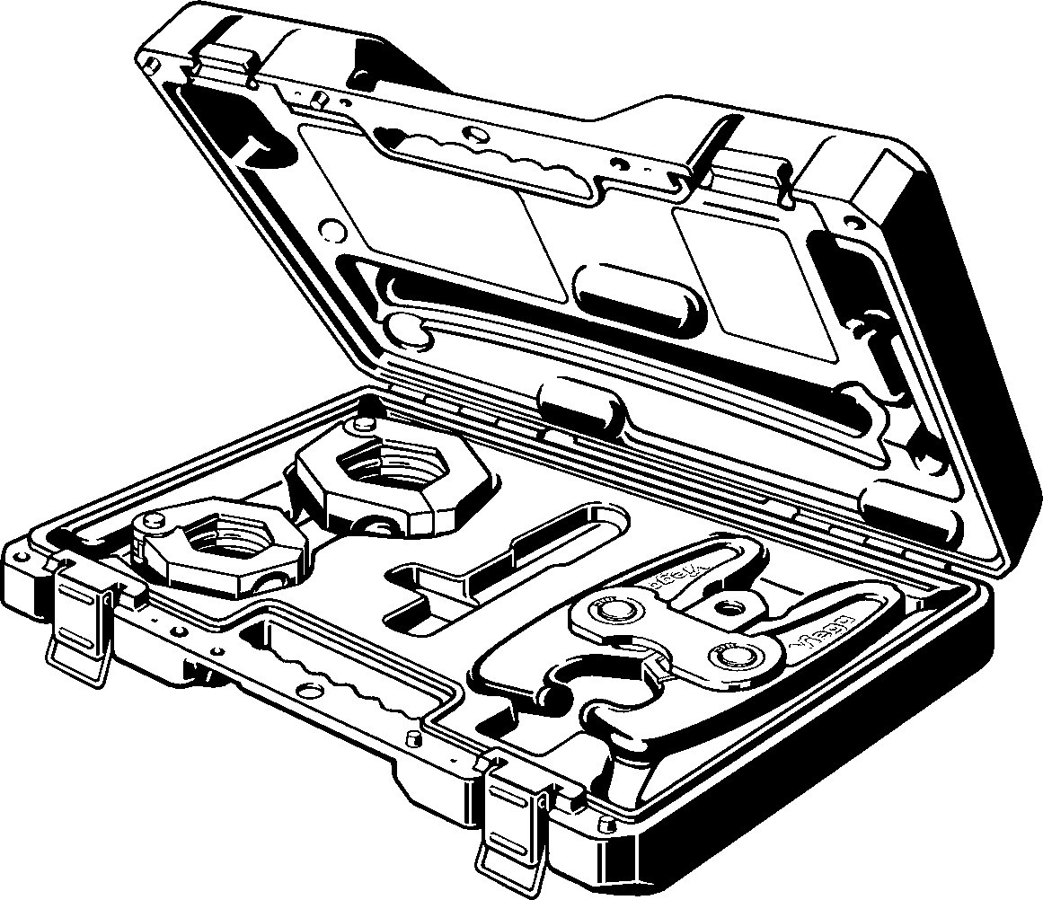 für metallene Pressverbindersysteme, empfohlen für Pressgun 6 Plus, Pressgun 6, Pressgun 6B, Pressgun 5, Pressgun 4B und 4E, Pressmaschinen PT3-H/EH, PT3-AH und Typ 2 (PT2), Akku-Pressmaschinen des Herstellers Holger Clasen, Geberit/Mepla-Pressmaschinen Typ PWH 75, Typ N 230 V und Typ N Akku, Geberit/Mapress-Pressmaschinen Typ EFPII, ACO 1, ECO 1, ACO 201, ECO 201, AFP 201, EFP 201, ACO 202 und ECO 202, Ridgid-Pressmaschinen RP 10-S, RP 10-B, RP 330C/330B, RP 340, mit Systemkoffer, Koffereinsatz Pressringe, Deckeleinlage, Gelenkzugbacke PT2, Pressring