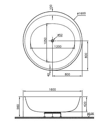 Höhe 560 mm, Sanitäracryl 5 mm, mit vormontierten Wannenfüßen, Ablaufgarnitur mit verdecktem Überlauf, Ablauf mittig, Inhalt 380 l, Wassertiefe 340 mm (Ablauf bis Unterkante Überlauf), ohne Hahnlochbank, Schürze (nicht abnehmbar)
