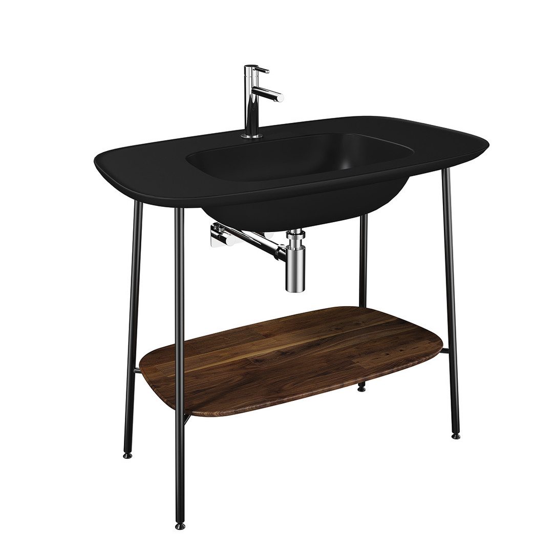 Ablage Echtholz, Metallrack schwarz matt lackiert, mit Möbelwaschtisch, VitrA Clean, 1 Hahnloch mittig, ohne Überlaufloch, Schaftventil mit Ventildeckel Keramik