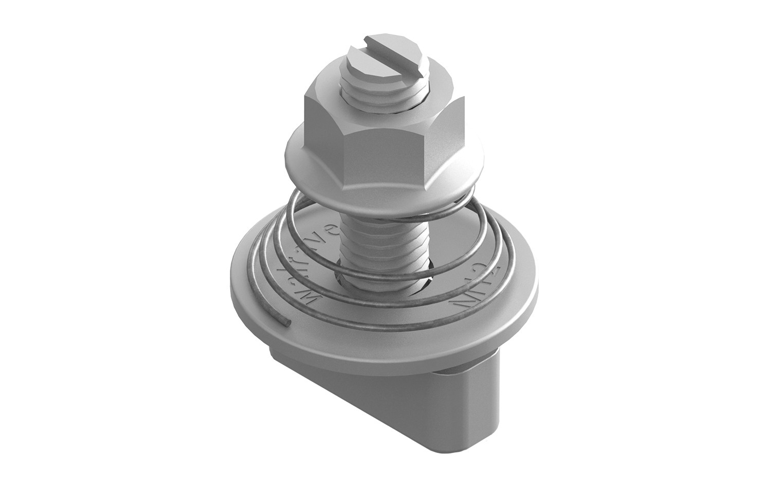 formschlüssiger Hammerkopf zur Befestigung von Verbindern an Maxx-Profilen, hält die Konstruktion vor dem endgültigen Festziehen in Position, Hammerkopf eindrücken, 90° drehen und mit Schraubenschlüssel fixieren, sichtbare Markierung auf der Oberseite um die Position des Hammerkopfes zu erkennen, mit Vierkantschaft zum Festsetzen im Profillochbild beim Anziehen, Material Stahl, Festigkeitsklasse 8.8, Feder aus Edelstahl (AISI 316), feuerverzinkt