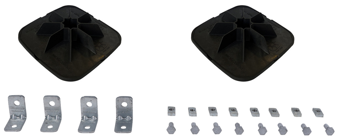 zur Montage und Aufständerung von Flachdachinstallationen, modulares Montagesystem zur Aufständerung von Klimageräten, Laufwegen, Lüftungsleitungen, Kabeltrassen u.v.m. auf Flachdächern, senkrechte Schienenanbindung mit RapidStrut 41x41, mit rutschfester Antivibrationsmatte zum Schutz der Dachmembrane (bei PVCDächern ist eine zusätzliche Trennlage zur Vermeidung von Weichmacherwanderungen erforderlich - siehe BIS Yeti Triplex Trennlage), Spritzgussteile aus WPC (Holz-Kunststoff-Verbundwerkstoff) bzw. PA mit 30% Glasfaseranteil, Kunststoffelemente vollständig recycelbar, Schallschutz nach DIN EN ISO 10140-1 und DIN EN ISO 10140-3, UV-beständig nach ISO 16474-3:2014-02 - zertifiziert durch ITB, bestehend aus: 2 x Walraven Yeti 280 Montagefuß mit rutschfester Antivibrationsmatte (Gummi), 4 x Walraven Strut Schienenverbinder 90°(BUP1000), 8 x Sechskantschraube und Schiebemutter