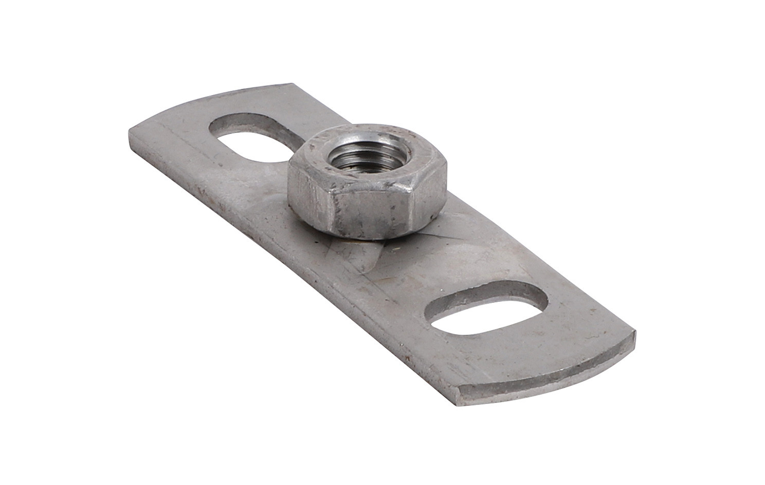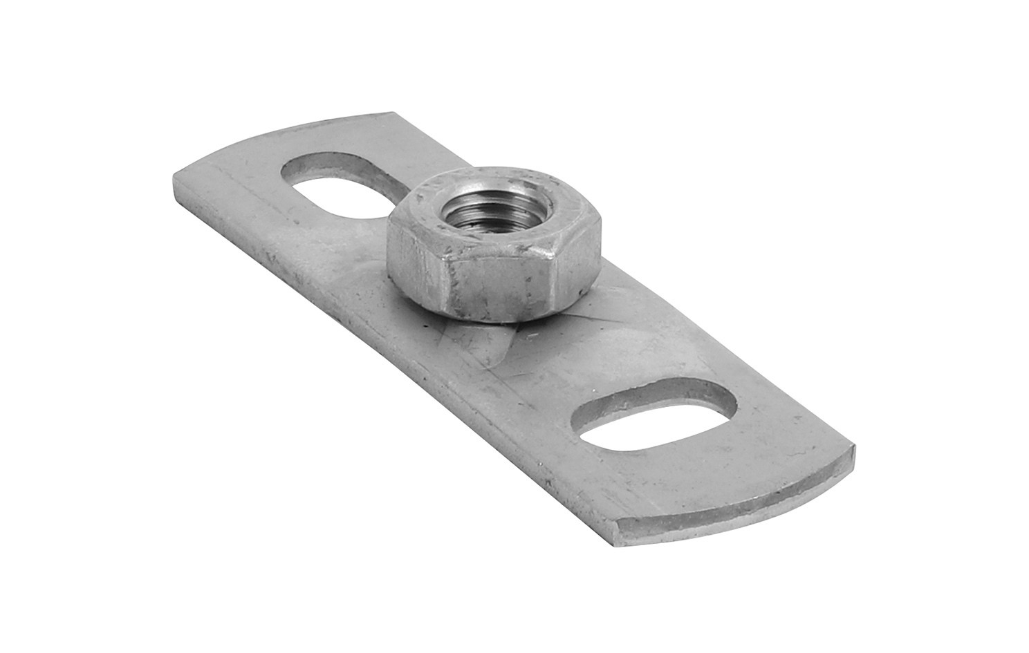 Befestigungslöcher sind als Langlöcher um 90° zueinander ausgestanzt, mit 4-fach angeschweißter Anschlussmutter